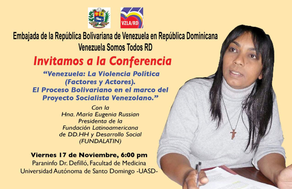 A propósito de este tema, la profesora María Eugenia Russian, presidenta de la Fundación Latinoamericana de DD.HH. y Desarrollo Social (Fundalatin), expondrá los principales aspectos relacionados en la conferencia “Venezuela: la violencia política (factores y actores). El proceso Bolivariano en el marco del Proyecto Socialista Venezolano”, evento que tiene lugar este viernes 17 de noviembre en el Paraninfo Doctor Defilló, de la Facultad de Medicina de la Universidad Autónoma de Santo domingo (UASD).