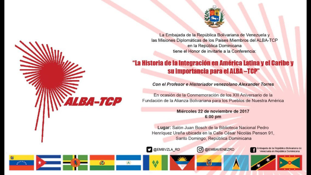 Santo Domingo, 21 de noviembre de 2017.- Con la finalidad de hablar sobre la importancia de los procesos de integración en los pueblos de América Latina y el Caribe, a propósito del venidero 13 aniversario de la Alianza Bolivariana para los Pueblos de Nuestra América, tratado de Comercio de los Pueblos (ALBA-TCP), el profesor universitario e historiador Alexander Torres, realiza una visita de trabajo de 4 días en la República Dominicana.