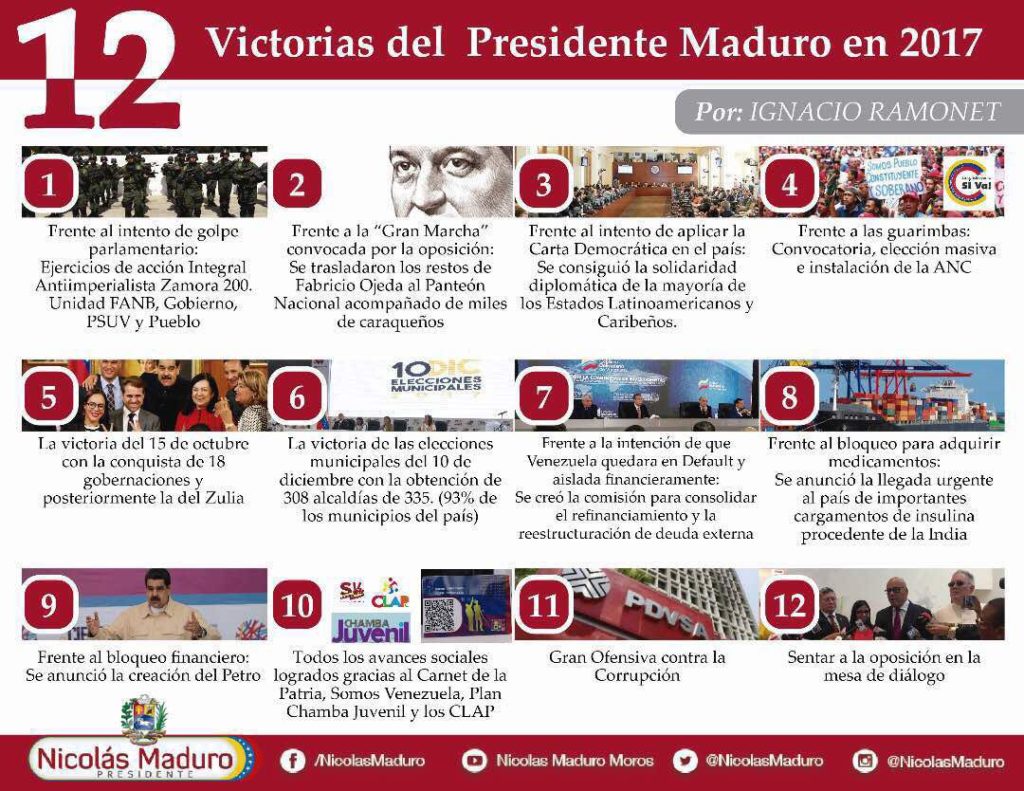 Mostrando al mundo la vitalidad de su sistema democrático, Venezuela fue el único país que organizó, en 2017, tres grandes elecciones nacionales. La tres ganadas por el chavismo. Mientras la derecha, desmoralizada por tantos desastres sucesivos, quedaba atomizada, desunida, groggy. Sus líderes enfrentados. Sus seguidores aturdidos. Aunque conservó el apoyo de sus protectores internacionales.